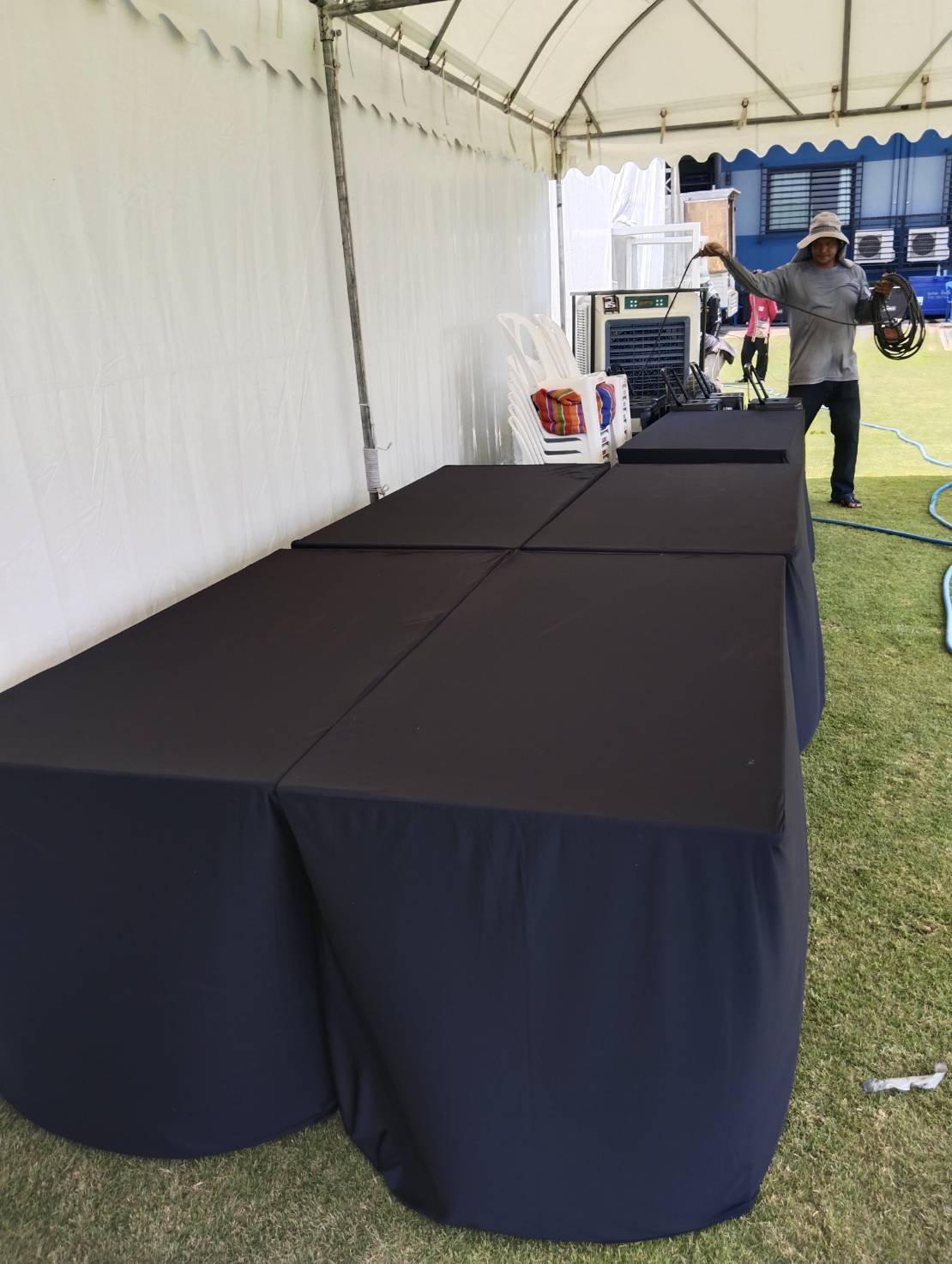 โต๊ะหน้ขาวสวมผ้าดำคุณภาพสูง เหมาะสำหรับงานอีเว้นท์ งานสัมมนา งานแถลงข่าว หรือบูธแสดงสินค้า ตัวผ้าเป็นแบบยืด (Stretch Fabric) เข้ารูปสวยงาม ไม่ยับ ช่วยพรางตาและเก็บซ่อนสิ่งของใต้โต๊ะได้อย่างมิดชิด ให้ความรู้สึกทันสมัยและเป็นระเบียบเรียบร้อย