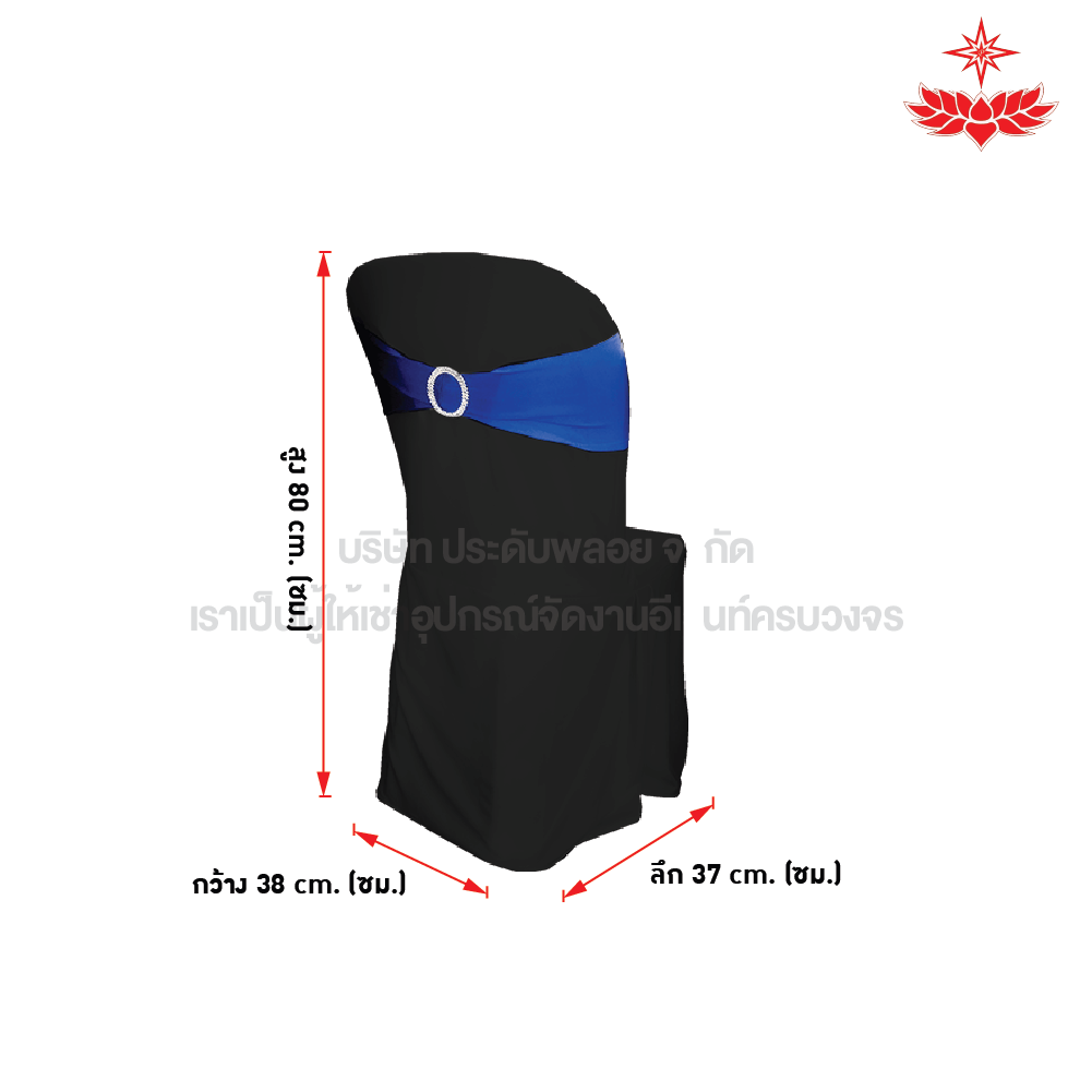 ผ้าดำปล่อยคลุมเก้าอี้พลาสติก + โบว์สีน้ำเงินวงกลม