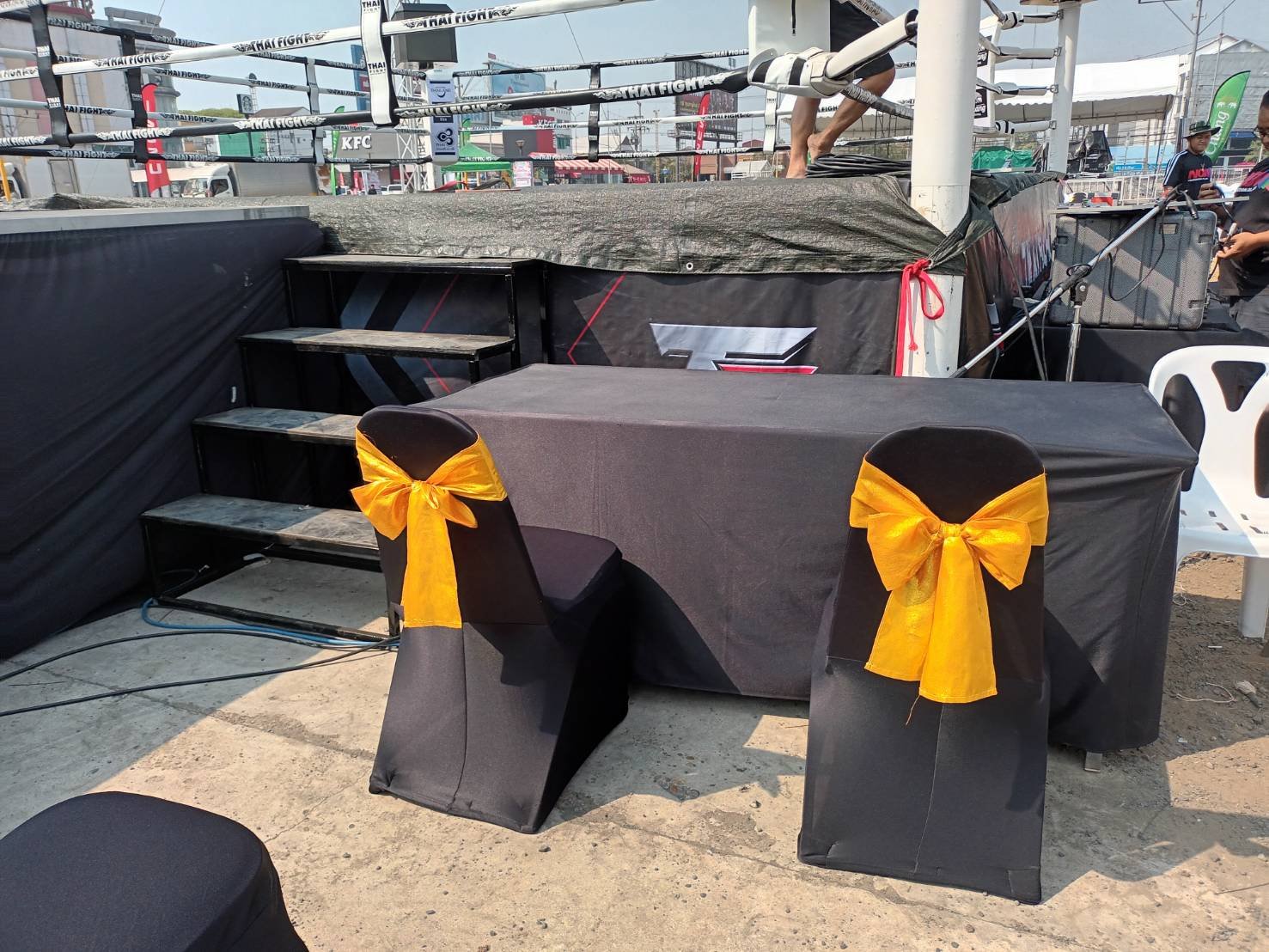 ผ้าดำตึงคลุมเก้าอี้บุนวม + โบว์สีเหลือง