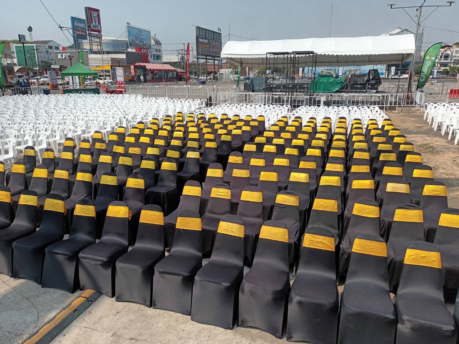 ยกระดับงานอีเวนต์ของคุณให้ดูหรูหราและมีสไตล์ด้วย เก้าอี้จัดเลี้ยงบุนวมคุณภาพสูง หุ้มด้วยผ้าสแปนเด็กซ์สีดำ (Black Spandex) แบบสวมตึงที่ให้ลุคทันสมัย เรียบเนียน ไร้รอยยับ เพิ่มความโดดเด่นด้วย โบว์ผ้าซาตินสีเหลืองสด ที่ช่วยสร้างจุดนำสายตาและเพิ่มบรรยากาศความหรูหรา เหมาะสำหรับงานที่ต้องการความภูมิฐานและเป็นทางการ