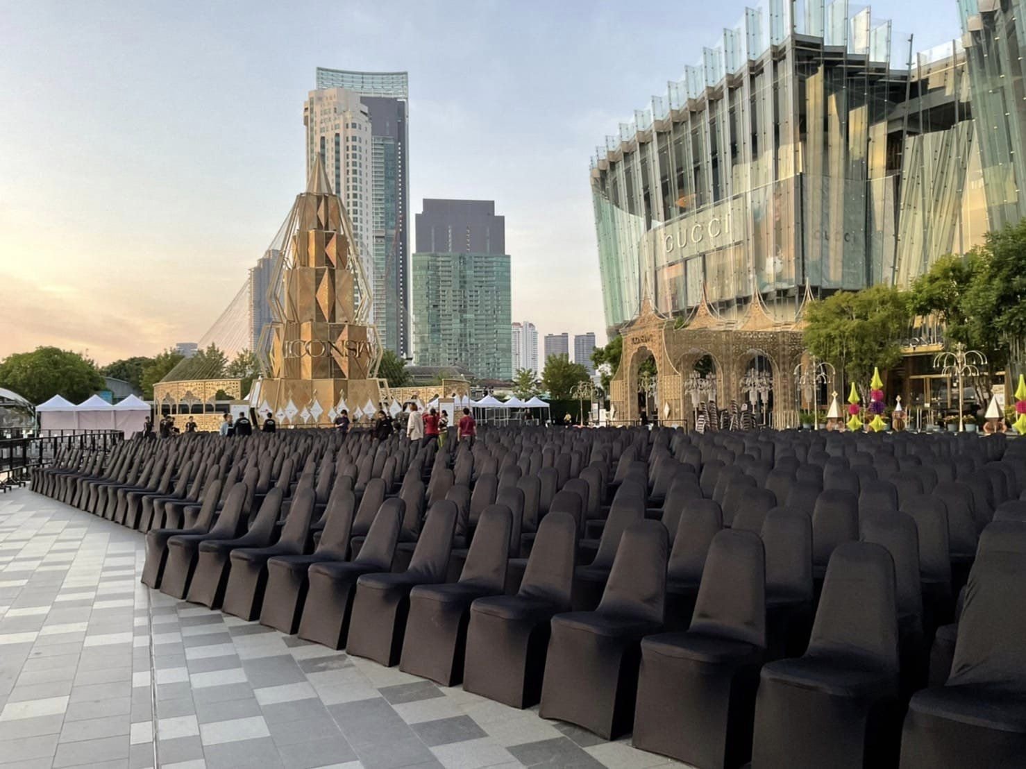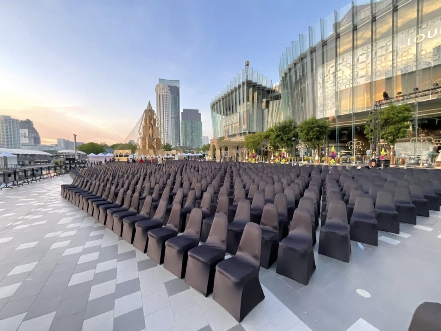 เก้าอี้พลาสติกสวมผ้าขาว + โบว์สีน้ำเงินวงกลม