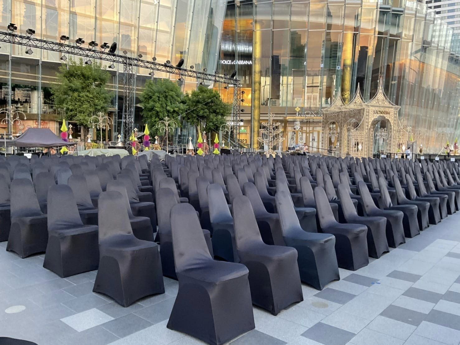 เก้าอี้พลาสติกสวมผ้าดำ + โบว์สีเหลืองวงกลม