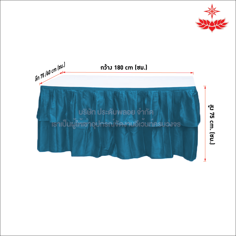 โต๊ะหน้าขาว 1.8x0.75/1.8x0.60 เมตร คลุมผ้าจีบสีฟ้า