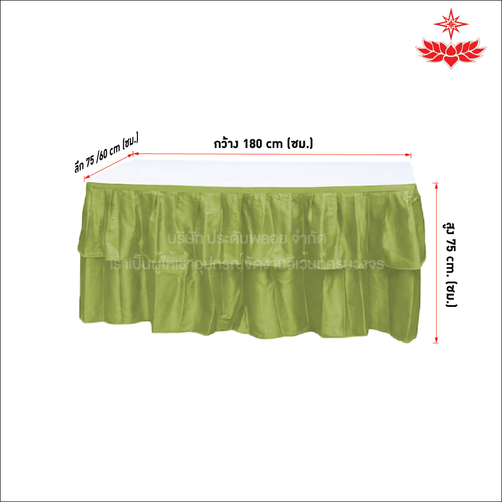 หากคุณกำลังเตรียมงานและต้องการ โต๊ะหน้าขาว 1.8x0.75/1.8x0.60 เมตร คลุมผ้าจีบสีเขียว ที่เชื่อถือได้ มีคุณภาพ และราคายุติธรรม ติดต่อเราได้ทันที ทีมงานของเราพร้อมให้คำปรึกษาและบริการอย่างมืออาชีพทุกขั้นตอน เพื่อให้งานของคุณเป็นไปอย่างราบรื่นและปลอดภัย