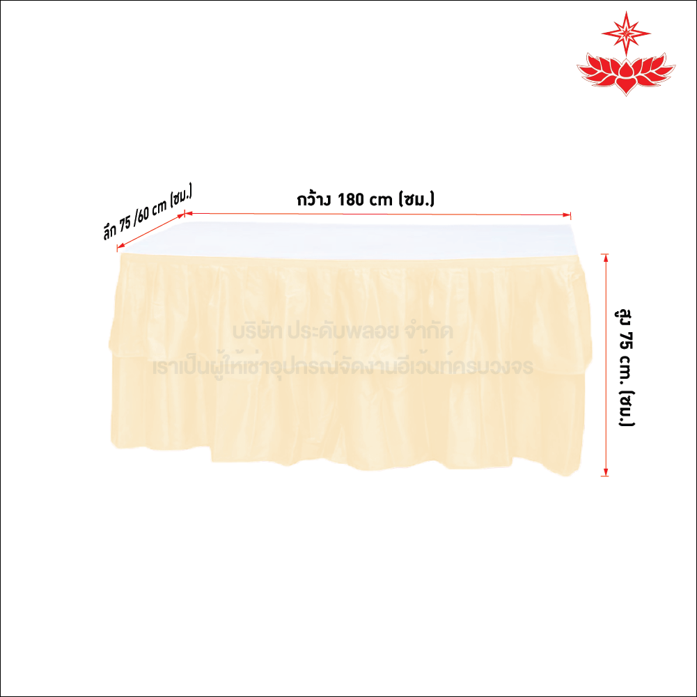 หากคุณกำลังเตรียมงานและต้องการ โต๊ะหน้าขาว 1.8x0.75/1.8x0.60 เมตร คลุมผ้าจีบสีครีม ที่เชื่อถือได้ มีคุณภาพ และราคายุติธรรม ติดต่อเราได้ทันที ทีมงานของเราพร้อมให้คำปรึกษาและบริการอย่างมืออาชีพทุกขั้นตอน เพื่อให้งานของคุณเป็นไปอย่างราบรื่นและปลอดภัย