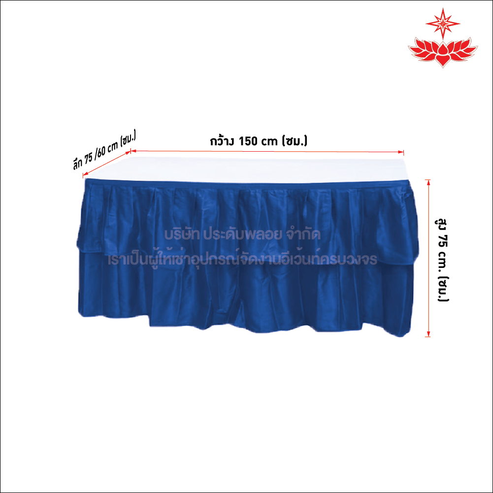 หากคุณกำลังเตรียมงานและต้องการ โต๊ะหน้าขาว 1.5x0.75/1.5x0.60 เมตร คลุมผ้าจีบสีน้ำเงิน ที่เชื่อถือได้ มีคุณภาพ และราคายุติธรรม ติดต่อเราได้ทันที ทีมงานของเราพร้อมให้คำปรึกษาและบริการอย่างมืออาชีพทุกขั้นตอน เพื่อให้งานของคุณเป็นไปอย่างราบรื่นและปลอดภัย
