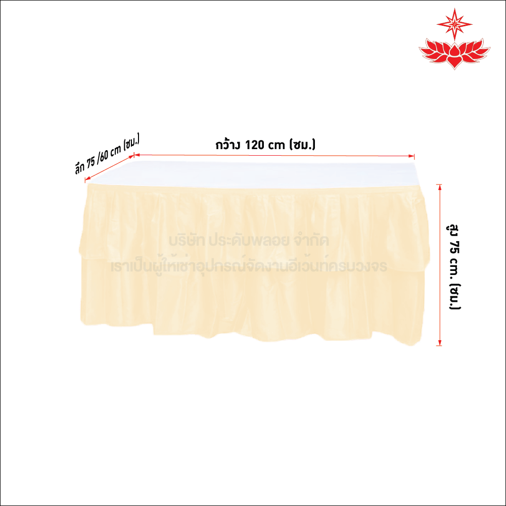 สนใจเช่าโต๊ะหน้าขาว 1.2x0.75/1.2x0.60 เมตร คลุมผ้าจีบสีครีม ได้มาตรฐาน รับประกันความพึงพอใจ ติดต่อ